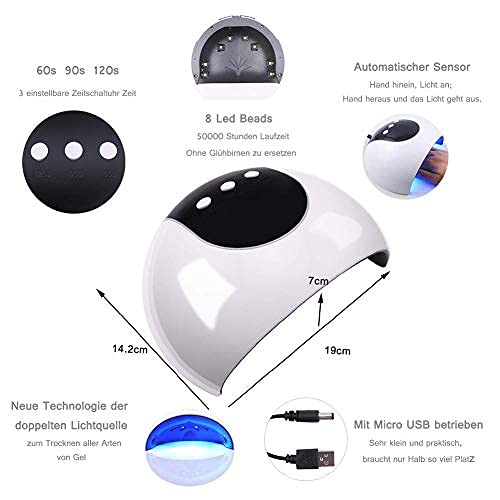 Instelbare Timer: 60S / 90S / 120S — Met het lampje gaat aan met een druk op de knop en het aftellen begint. Auto-Sensor: het gaat automatisch aan of uit als je je hand / voet erin / eruit haalt